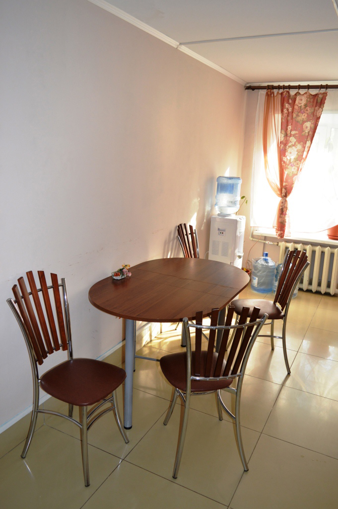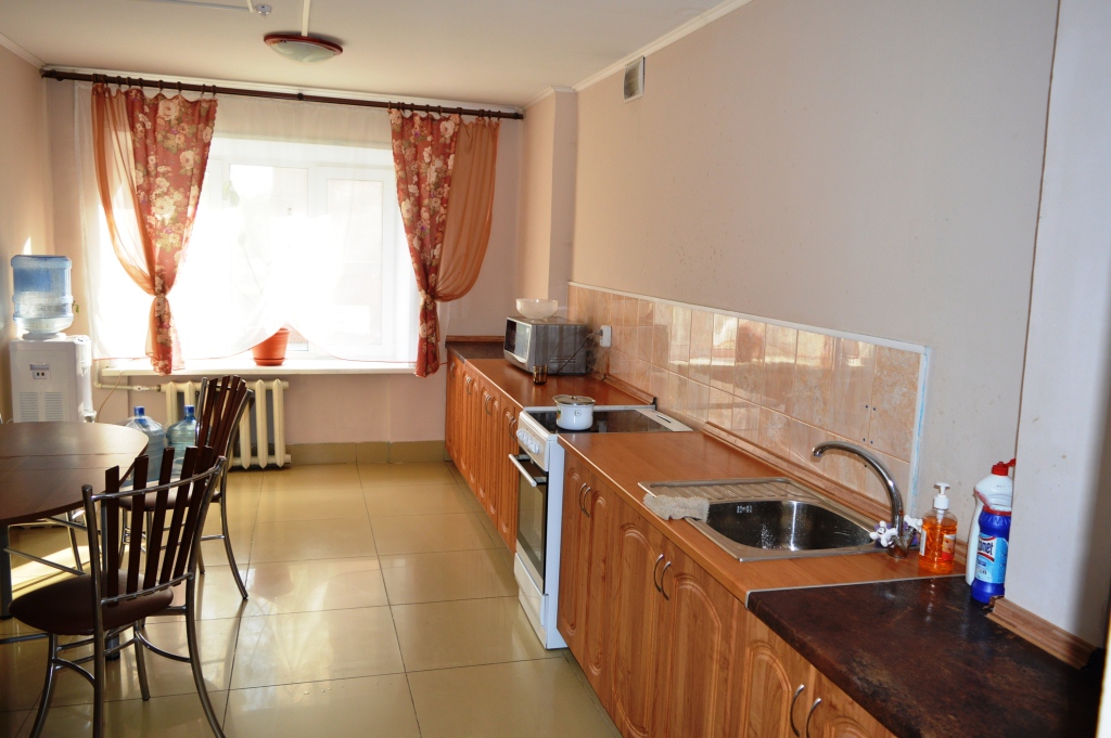 Оказавшись в общей кухне, вашему пользованию будут представлены : большой кухонный гарнитур со всеми необходимыми принадлежностями , большой холодильник , микроволновая печь , чайник , четырех комфортная электрическая плита с духовкой , кулер с чистой родниковой водой , так же удобный обеденный стол и четыре стула.